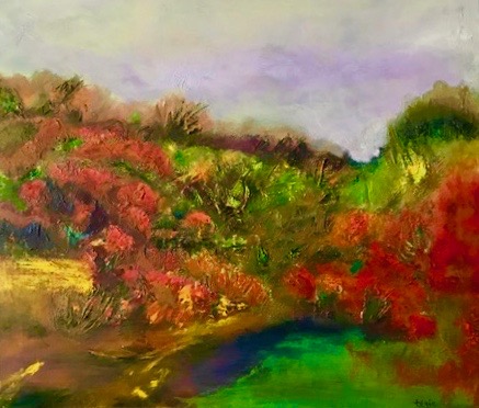 Je débute souvent mes toiles en créant des taches de couleur qui ensuite s’agencent où se contrastent.