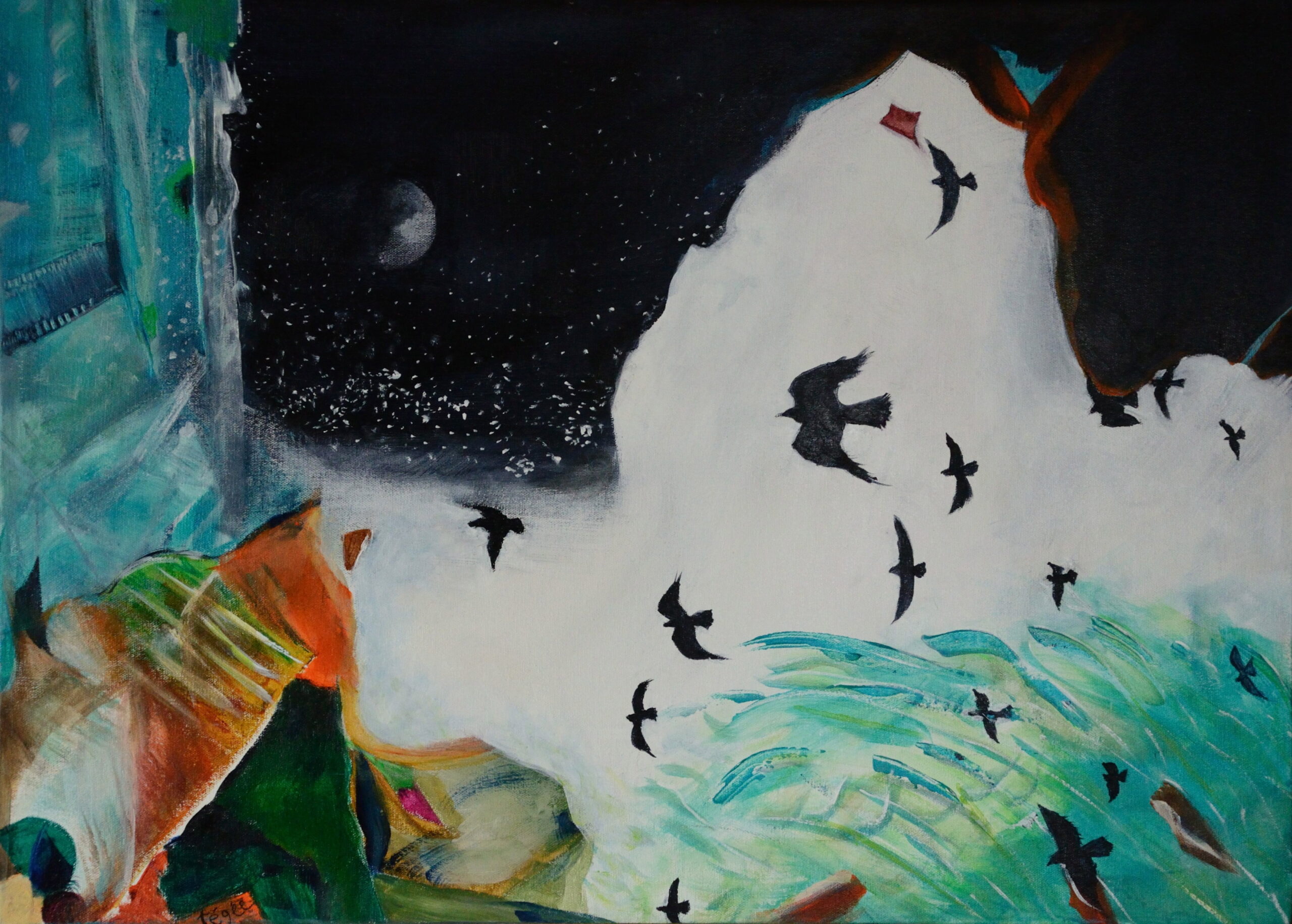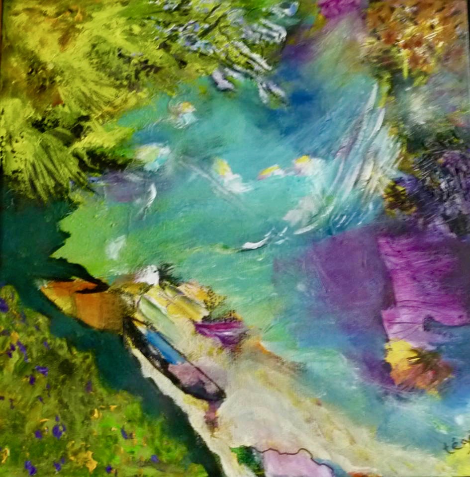 Je débute souvent mes toiles en créant des taches de couleur qui ensuite s’agencent où se contrastent.